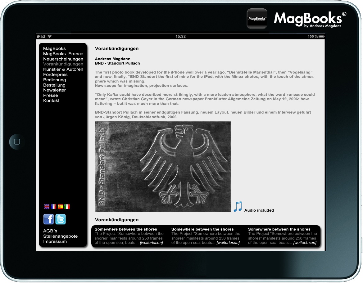MagBooks©est un Éditeur de livres « papier » mais aussi d’Applications (Apps) pour Apple Store, à savoir des Applications concernant l’Art, le Design et la Photographie d’auteurs, sous forme de livre numérique. Une Application Magbooks© permet de télécharger avec iTunes une oeuvre d’Artiste.